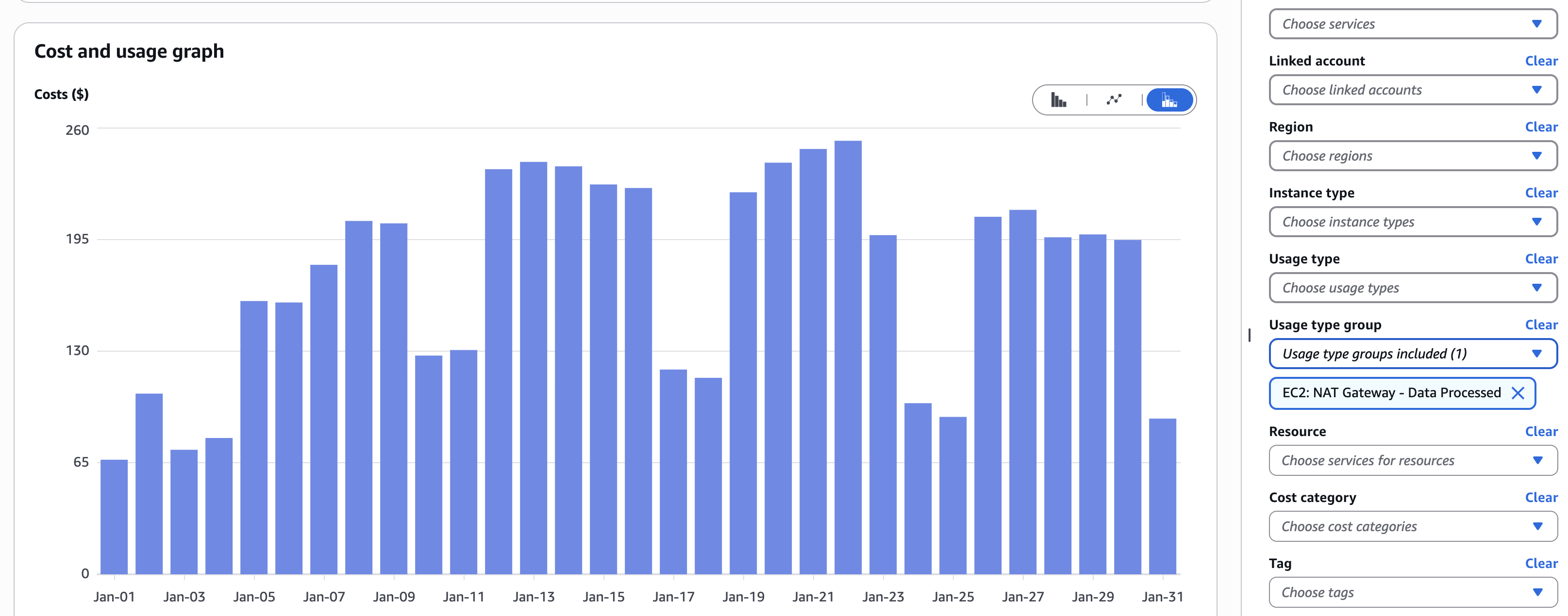 - Service / usage type (NAT often appears under “EC2-Other” depending on the line item)