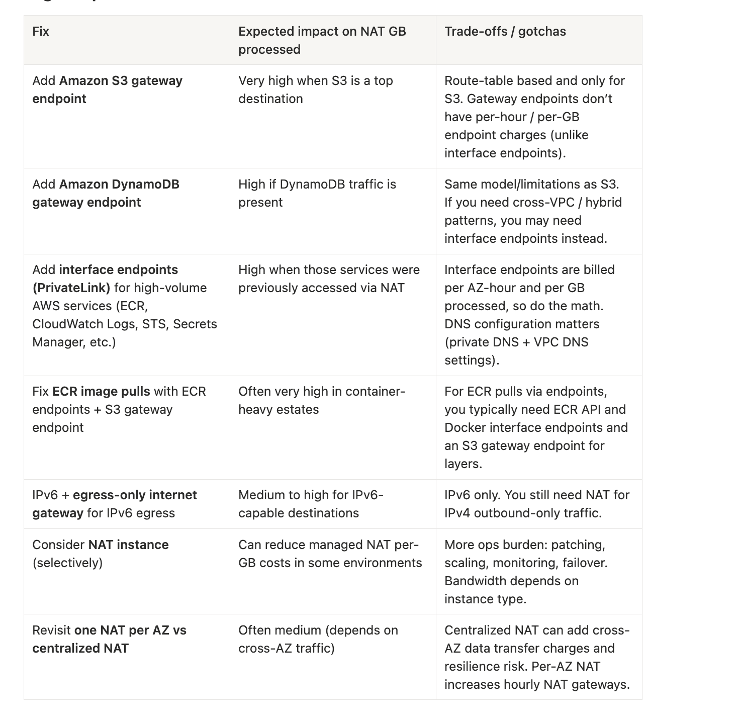- High-impact remediation options (gateway endpoints, PrivateLink, per‑AZ NAT, IPv6)