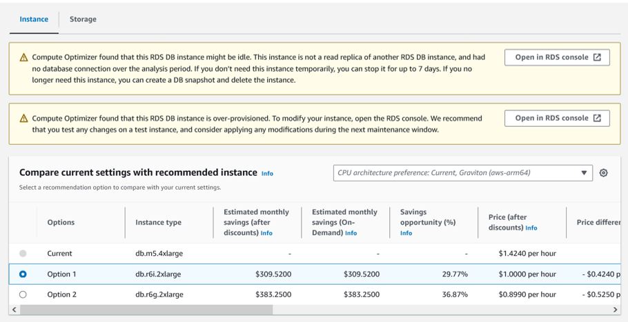 You get up to two alternative instance recommendations per DB instance — typically one x86 and one Graviton — with estimated monthly savings attached.