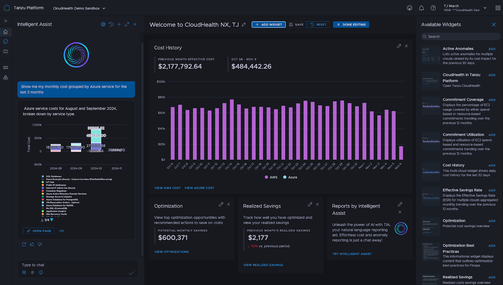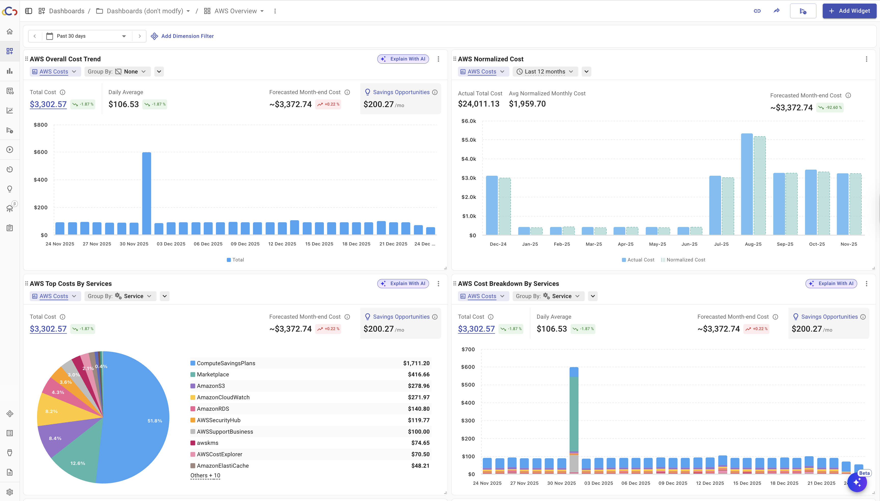 Users can create dashboards directly from billing reports or custom filters, making it easy to track key metrics over time and tailor views for different teams or stakeholders. Dashboards are fully customizable with a wide range of widgets, including Billing Explorer, Cost Anomalies, Commitment Utilization, Coverage, Normalized Cost, Savings Opportunities, Carbon Emissions, Unit Cost, and more, giving finance, engineering, and leadership clear visibility into the metrics that matter most.