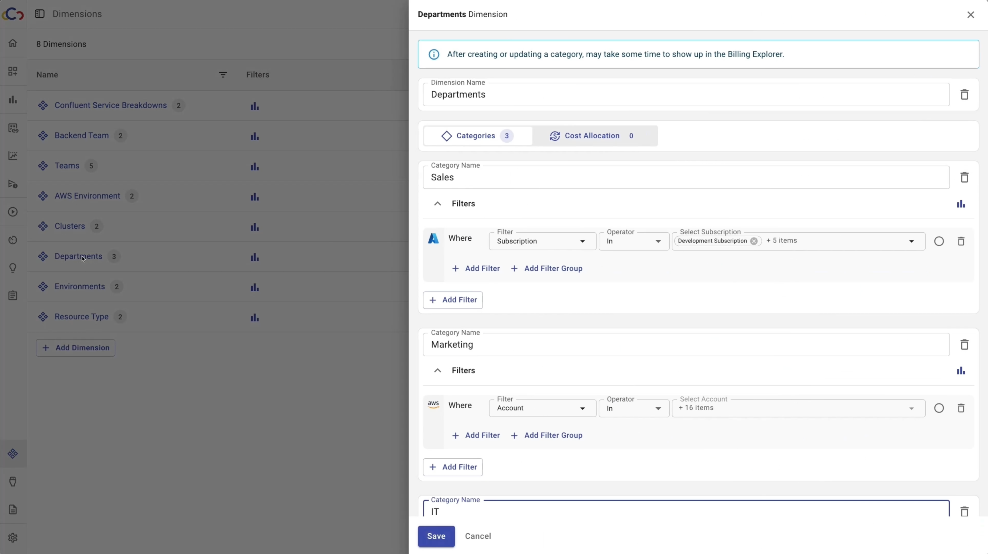 Dimensions allow teams to organize and analyze cloud costs in a way that matches how their business is structured. Each Dimension is made up of categories, which are groups of rules that act like virtual tags, grouping resources without requiring perfect tagging.
