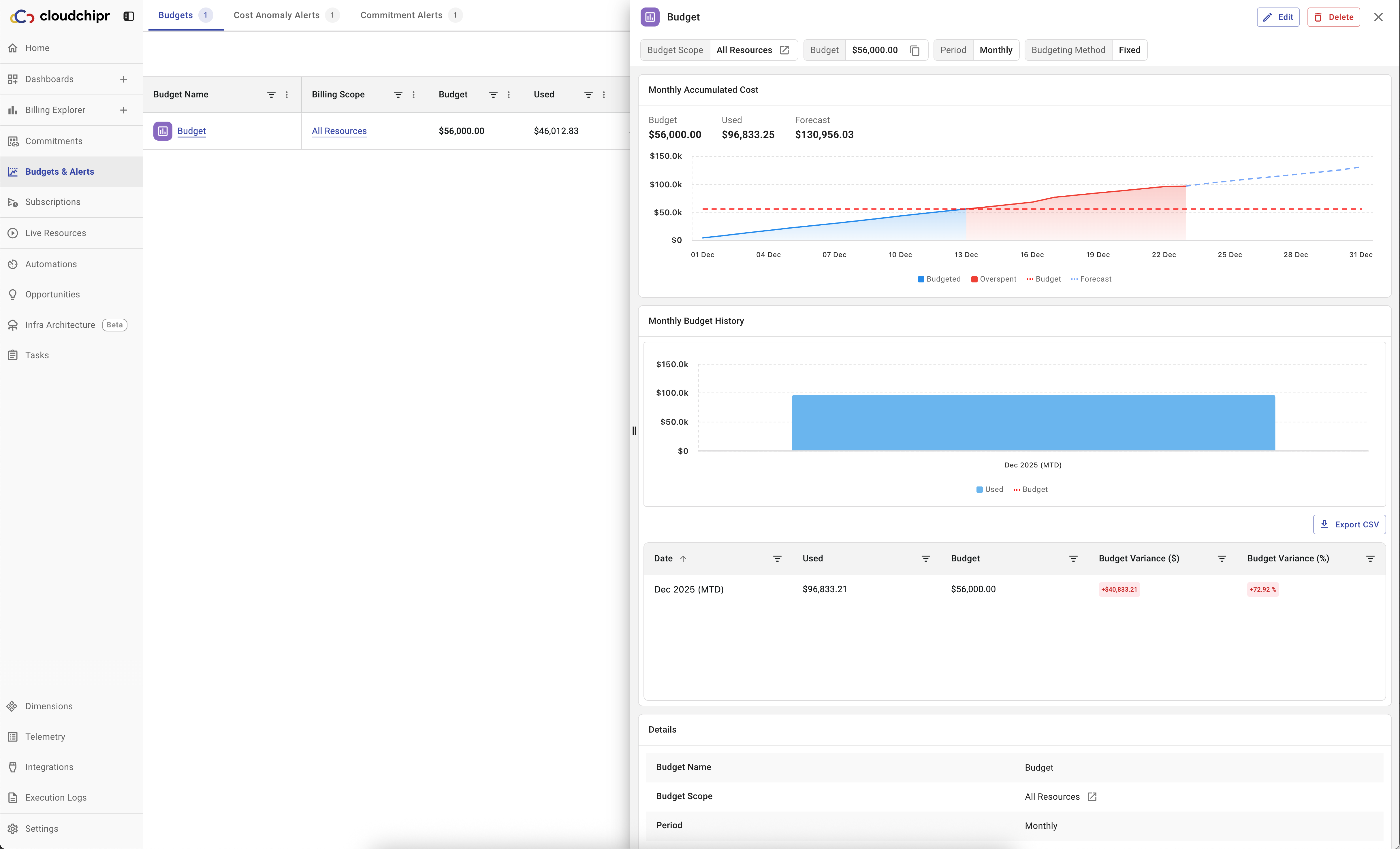 Budgets can be created from billing reports or custom filters, aligning them with how cloud spend is organized across the environment. Users can track both actual and forecasted spend and receive alerts before limits are exceeded.