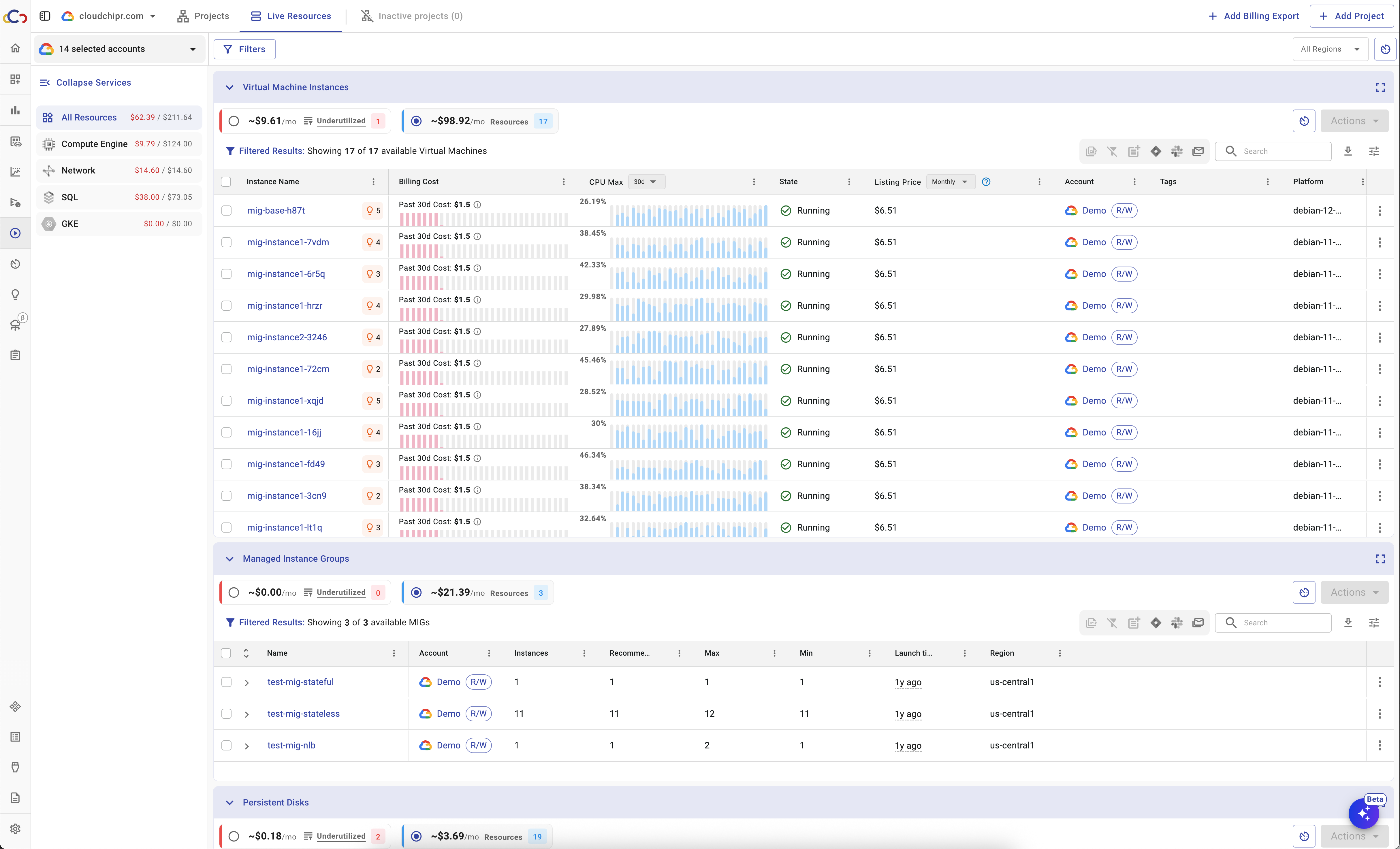 Cloudchipr's Live Resources gives a real-time, unified view of all cloud resources across AWS, Azure, GCP, and Kubernetes. Users can see usage metrics in one place, without switching between cloud consoles. Each resource is fully actionable; users can stop, start, reboot, snapshot, delete, or protect resources, and see related costs, usage history, commitment coverage, and savings opportunities.