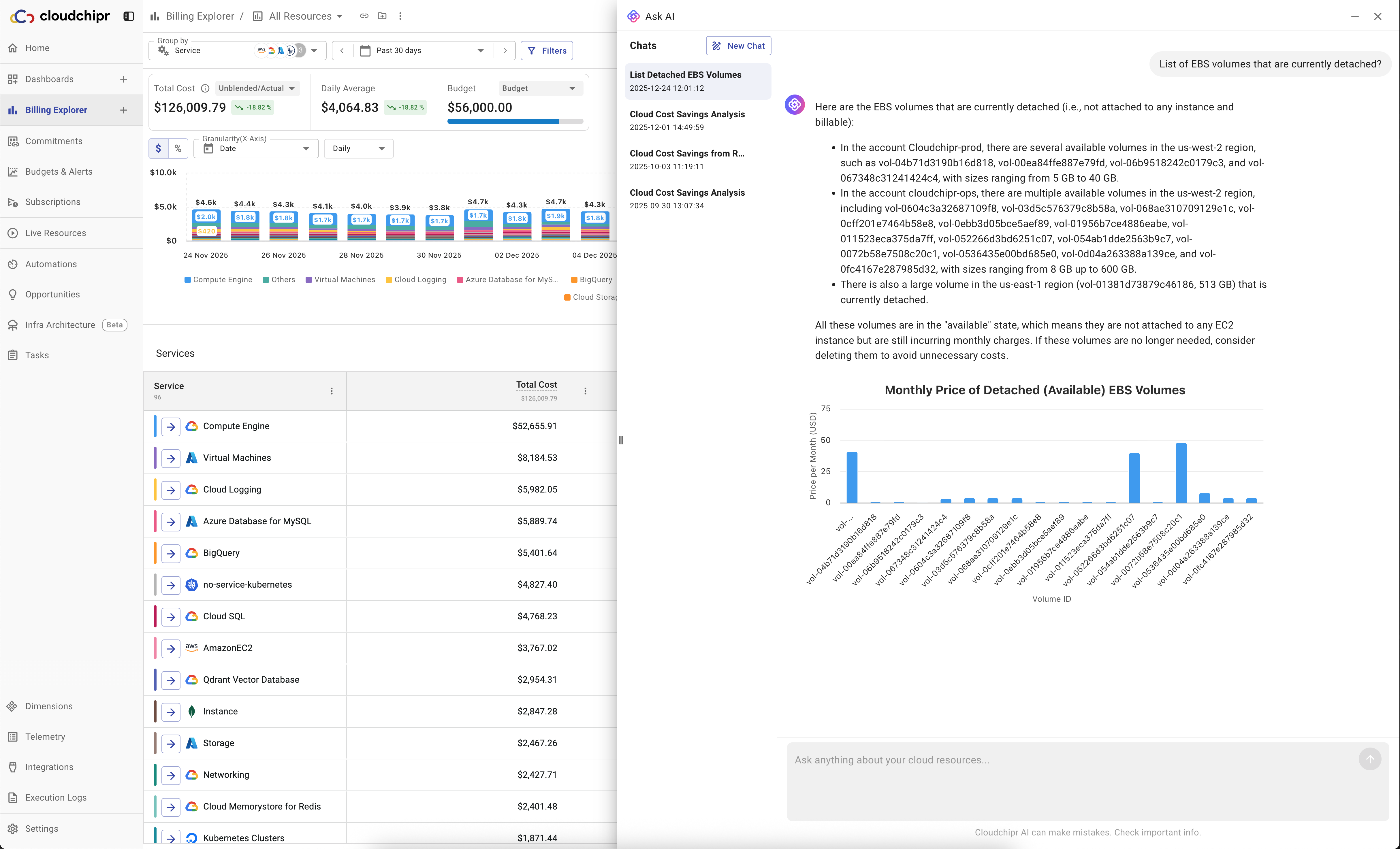 Cloudchipr AI Agents act as on-demand FinOps and DevOps experts inside the platform. Users can ask questions in plain language to understand costs, explain reports, analyze trends, and generate charts or reports.
