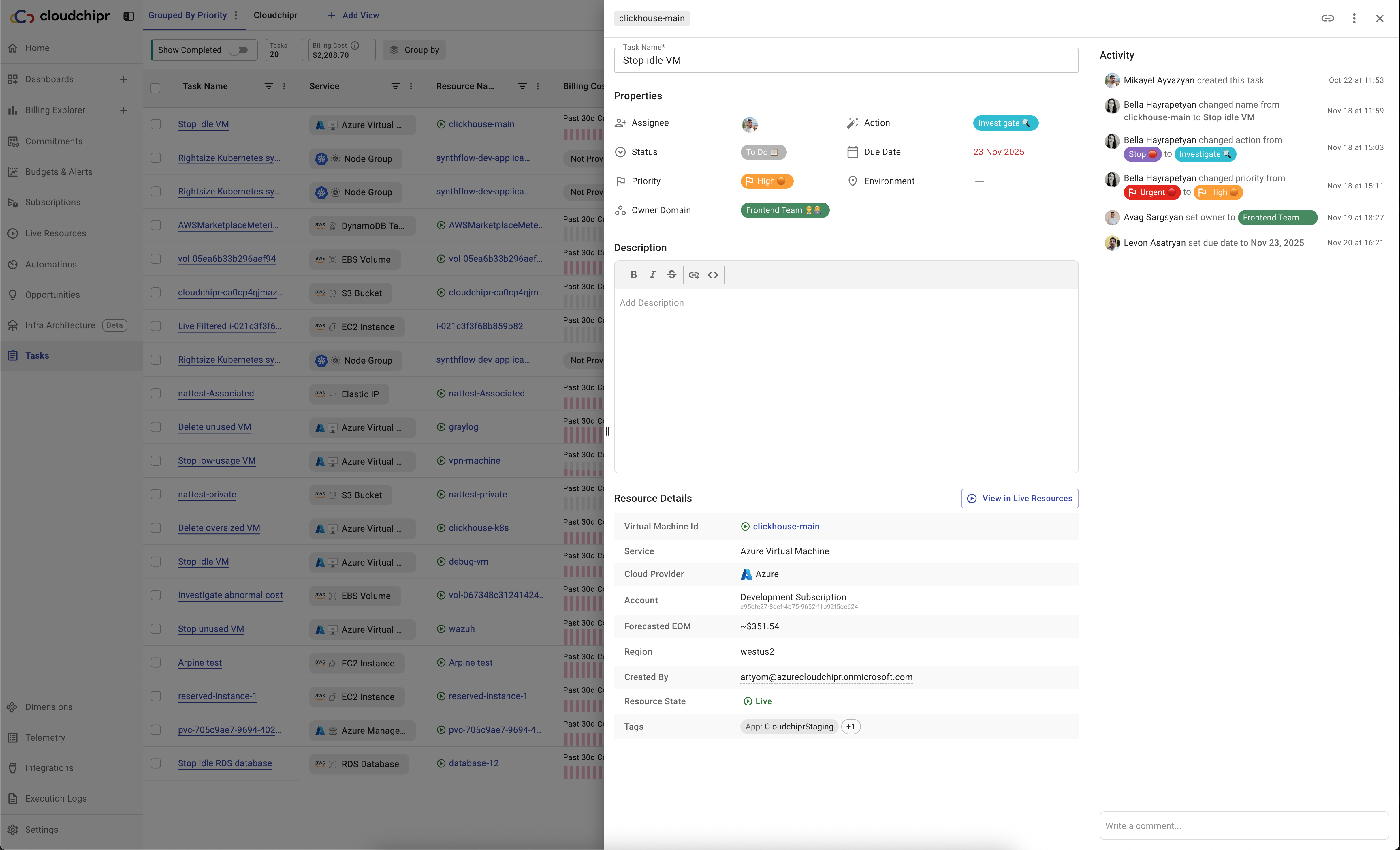 When an issue is found, users can create tasks directly from live resources or savings opportunities, assign owners, give priorities and due dates, and track until completion. This makes it easy for teams to collaborate with clear accountability and shared visibility.