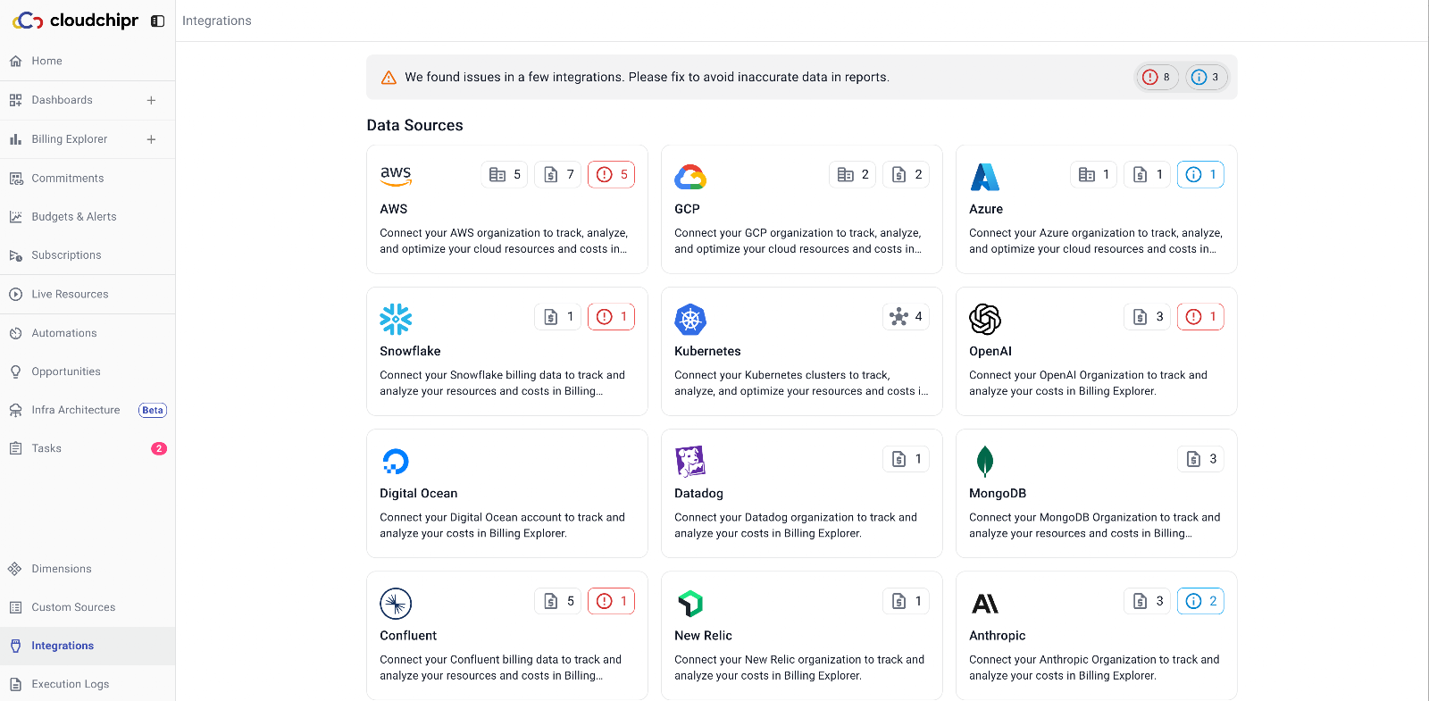 AWS and GCP connections are now available directly from the Integrations page. You can manage and connect your cloud organizations from a centralized location.