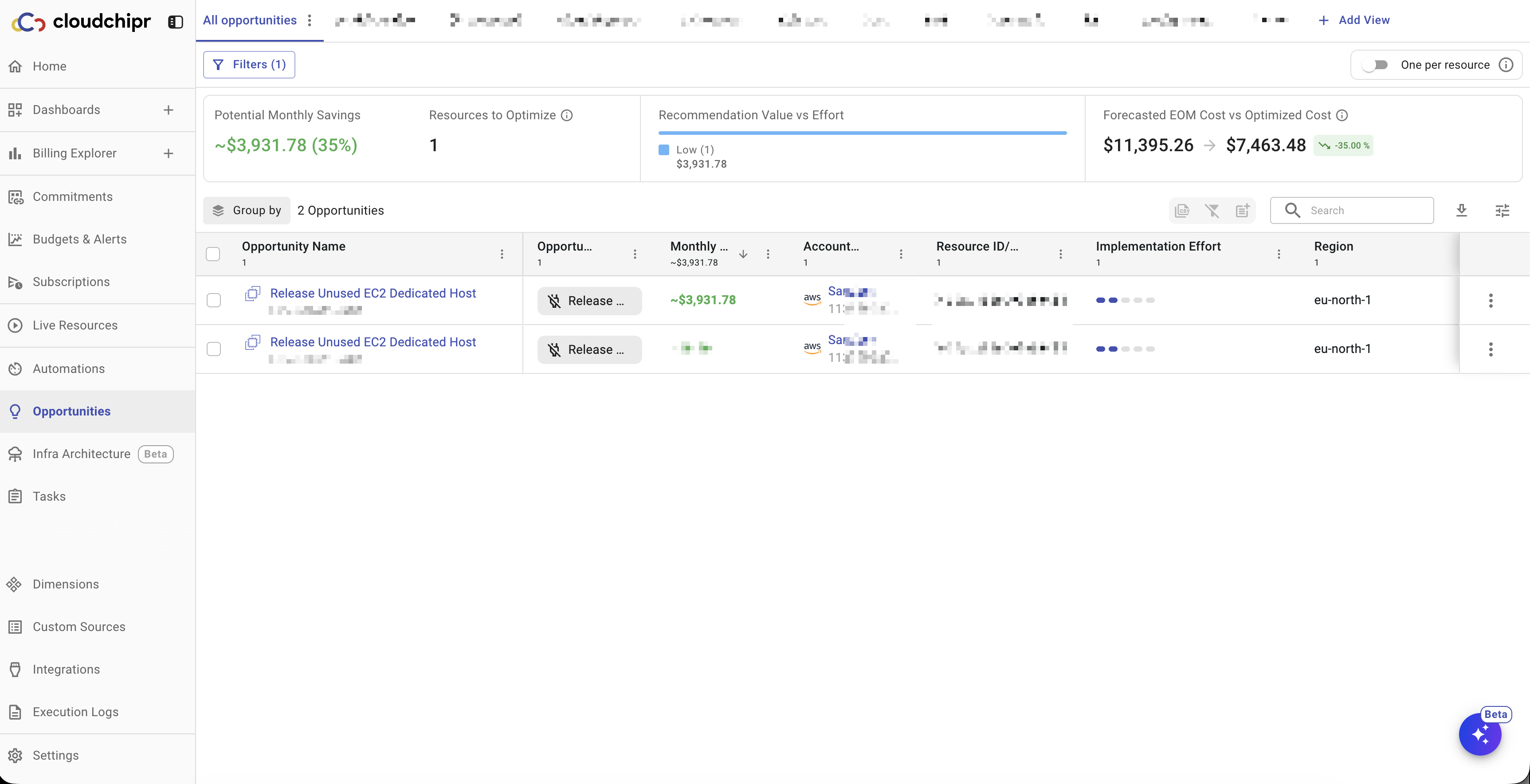 Savings Opportunities now include EC2 Dedicated Host recommendations. Cloudchipr identifies Dedicated Hosts that have no running instances but are still incurring charges. Releasing these unused hosts eliminates unnecessary costs.