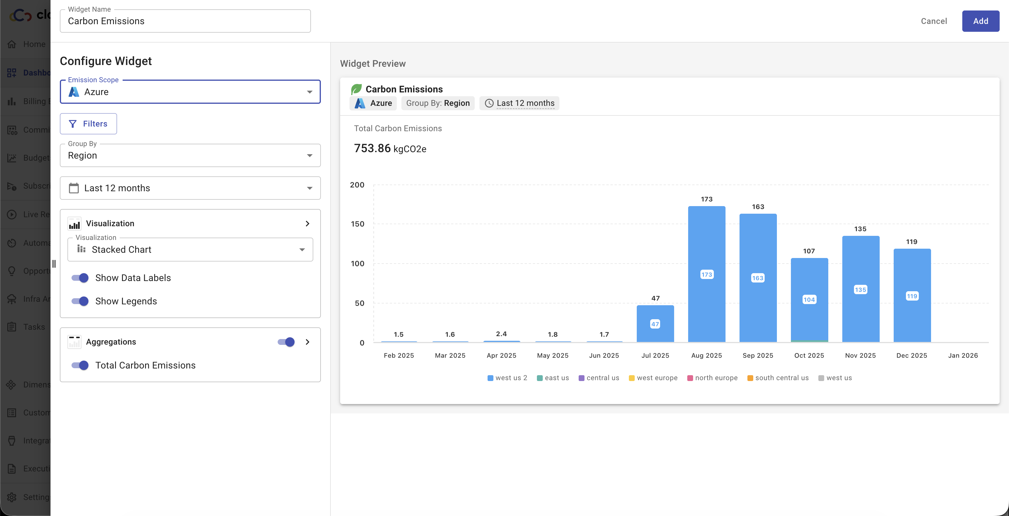 A Carbon Emissions widget now supports Azure. This widget allows you to track Azure-related carbon emissions over time, helping teams monitor environmental impact alongside cost metrics.